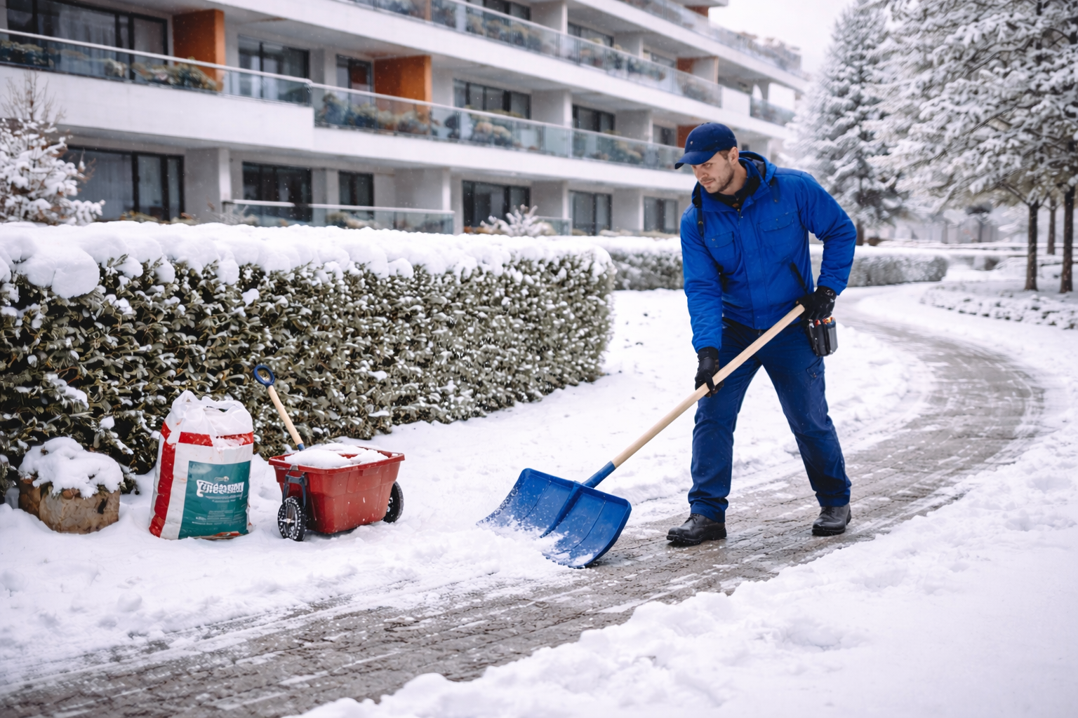 In der Winterzeit ist ein zuverlässiger Winterdienst besonders wichtig. Wir übernehmen das Räumen von Schnee sowie das Streuen von Gehwegen, Einfahrten und Außenflächen – pünktlich, zuverlässig und nach Absprache.